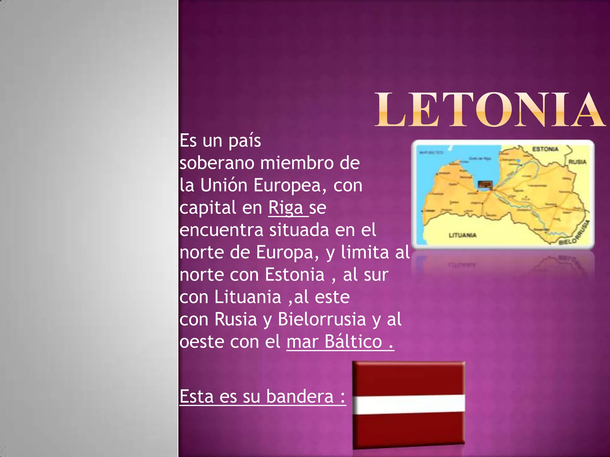 Letonia es un país soberano miembro de la Unión Europea ubicado en Europa del Norte. Limita con Estonia, Lituania, Rusia y Bielorrusia, y su capital y ciudad más grande es Riga. La cultura letona se caracteriza por sus canciones y leyendas folclóricas tradicionales. El gobierno es presidencial y el presidente se elige cada cuatro años. La gastronomía letona incluye pescados ahumados y platos de carne como cerdo y ternera, además de sopas y caldos tradicional