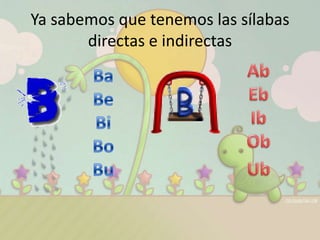 El documento presenta información sobre la letra B, incluyendo sílabas directas e indirectas con B y un cuento corto sobre una bruja buena. El cuento trata sobre una bruja que pesca una ballena mientras vuela en su escoba y descubre un mensaje dentro de una botella que la hace reírse hasta que se traga un bicho. El documento también incluye una lista de palabras relacionadas con la letra B.