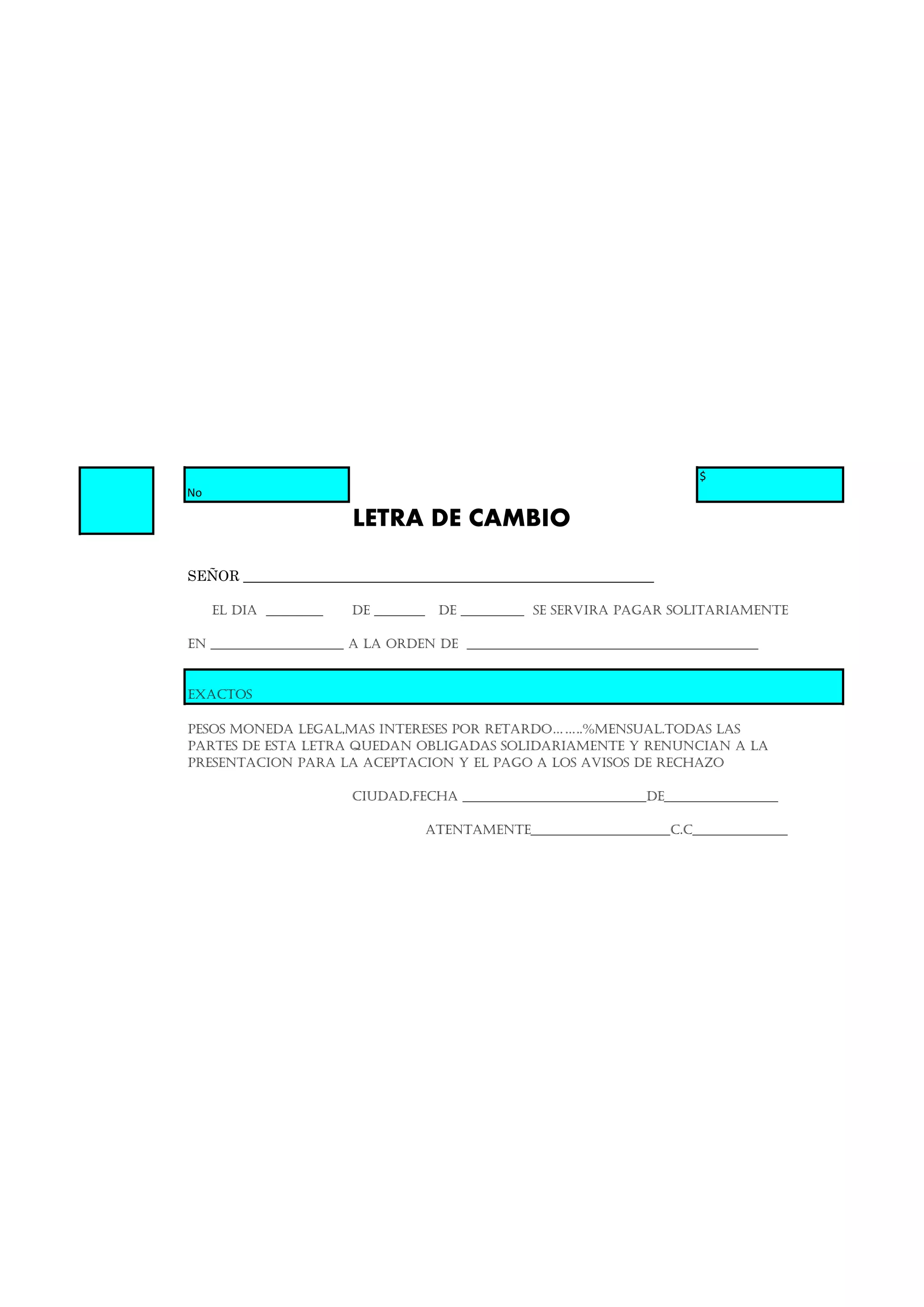 Este documento es una letra de cambio en la que el emisor se compromete a pagar una cantidad de dinero en efectivo a la orden de otra persona en una fecha determinada. Si el pago se retrasa, se aplicarán intereses por mora a una tasa mensual especificada. Tanto el emisor como el beneficiario de la letra de cambio asumen responsabilidad solidaria y renuncian a los requisitos de aceptación y aviso de rechazo.