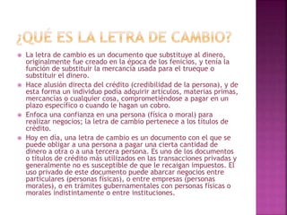 La letra de cambio es un documento mercantil que sustituye al dinero y permite realizar transacciones comerciales a plazo. Se originó en la antigua Fenicia y permite a un individuo adquirir bienes comprometiéndose a pagar en el futuro. Hoy en día es un documento que obliga legalmente a una persona a pagar una cantidad de dinero a otra u otra tercera persona en una fecha determinada.