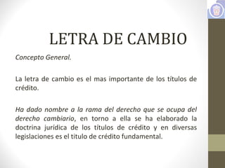 Este documento presenta una introducción a las letras de cambio. Define una letra de cambio, explica sus elementos personales y relativos, y describe los diferentes tipos de vencimiento que puede tener una letra de cambio, incluyendo vencimiento a la vista, a cierto tiempo vista, a cierto tiempo fecha y a día fijo. También analiza algunas cláusulas adicionales comunes en las letras de cambio como número de la letra, expedición de ejemplares, mención de "única", y letra documentada.