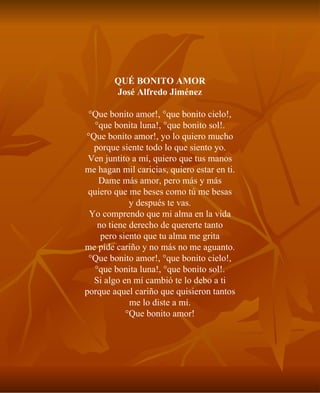 Este documento contiene varias canciones de amor mexicanas populares. Las canciones tratan temas como el amor, el desamor, los recuerdos y la nostalgia. Algunas canciones describen la belleza de un lugar o una persona amada. En general, las letras expresan sentimientos de añoranza, pasión y tristeza relacionados con las relaciones y experiencias amorosas.