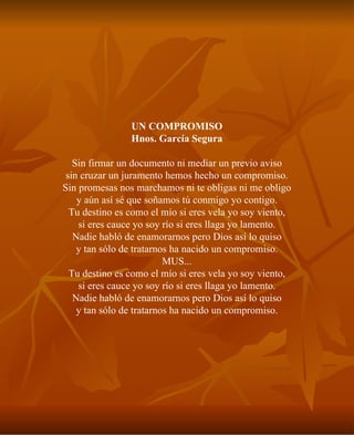 El primer documento expresa el dolor de no poder estar con la persona amada un año más y el sufrimiento que esto causa. El segundo documento describe un compromiso surgido entre dos personas a pesar de no haber firmado ningún acuerdo. El tercer documento ofrece el consejo de amar menos para no sufrir tanto.