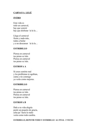 El documento presenta dos canciones escritas por alumnos de 6o primaria del CEIP Domínguez Alfonso para el carnaval de febrero de 2014 en Tenerife. La primera canción, "Orotavense de corazón", expresa el orgullo y la alegría de unirse a las celebraciones del carnaval con amigos. La segunda canción, "Carnavalelé", habla de cómo el carnaval puede alegrar la vida y alejar las penas bailando y disfrutando de la fiesta.