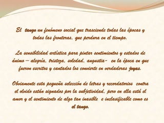 Este documento presenta resúmenes de varias letras de tangos argentinos clásicos. Describe sentimientos como la tristeza, la soledad y el desamor a través de temas recurrentes como el alcohol, la nostalgia y el abandono. También incluye información histórica sobre los compositores y el contexto social en el que fueron escritas algunas de las letras.