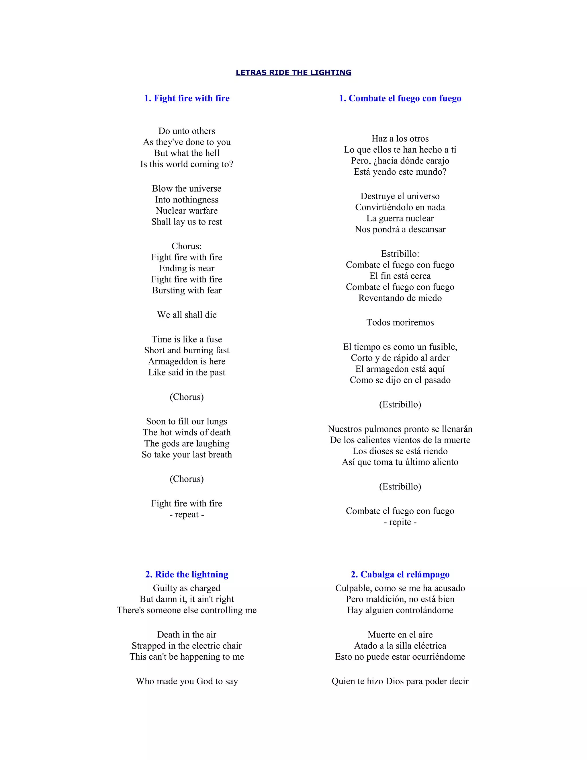 El documento presenta 5 canciones de la banda de heavy metal Metallica. Cada canción describe temas oscuros como la guerra nuclear, la pena de muerte, la batalla y la muerte. Las letras usan imágenes violentas y lenguaje crudo para transmitir mensajes sobre la destrucción, el sufrimiento y la lucha contra el control externo.
