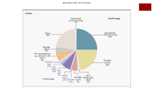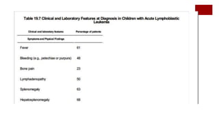 Este documento describe la leucemia linfoblástica aguda. Define la leucemia como una proliferación maligna de clones en el sistema hematopoyético que puede invadir la médula ósea y otros tejidos. Explica que la leucemia surge de una célula progenitora con daño genético que conduce a una proliferación anormal. Además, discute la epidemiología, etiología, manifestaciones clínicas, diagnóstico, tratamiento y clasificación de la leucemia linfoblástica aguda.