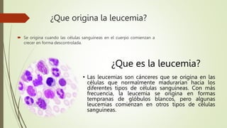 La leucemia se origina cuando las células sanguíneas comienzan a crecer de forma descontrolada. Existen varios tipos de leucemia que se clasifican como agudas o crónicas dependiendo de su velocidad de crecimiento, y si afectan a las células mieloides o linfoides. La leucemia más común en niños es la leucemia linfoblástica aguda. El tratamiento incluye quimioterapia, inmunoterapia y nuevos medicamentos dirigidos a cambios genéticos.