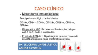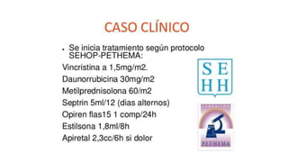 Las leucemias son las neoplasias malignas más comunes en la infancia, siendo la leucemia linfoblástica aguda (LLA) la más prevalente. El diagnóstico se realiza mediante análisis morfológico y citogenético de la médula ósea, y el tratamiento incluye fases de inducción, profilaxis y mantenimiento con quimioterapia. Los pacientes de alto riesgo pueden requerir trasplante de médula ósea para mejorar su pronóstico.
