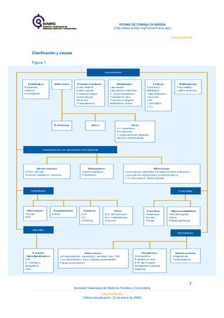 Este documento describe la leucocitosis, definida como recuentos de leucocitos superiores a 11x109/l. Explica los valores normales de leucocitos en diferentes edades y clasifica las causas de leucocitosis en infecciosas, neoplásicas y otras. Recomienda derivación a hematología ante leucocitosis persistente sin causa aparente o si hay afectación de otras series sanguíneas, adenopatías o esplenomegalia.