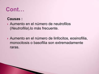 Este documento trata sobre varios términos relacionados con el recuento de leucocitos. Define leucocitosis como un aumento de leucocitos por encima de 10,000, causado comúnmente por infecciones. Explica que la leucopenia indica una depresión de la médula ósea por virus, bacterias o parásitos. También describe cómo el análisis de leucocitos puede guiar el diagnóstico y tratamiento de procesos febriles.