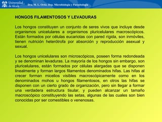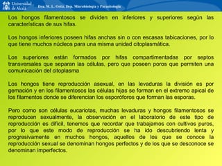 Los hongos incluyen organismos unicelulares como las levaduras y organismos pluricelulares como los hongos filamentosos. Estos últimos pueden ser inferiores, con hifas sin tabiques, o superiores, con hifas tabicadas. Todos los hongos se reproducen de forma asexual pero muchos también lo hacen sexualmente.