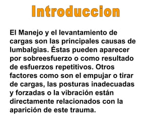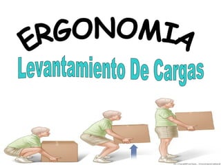 El documento habla sobre los factores de riesgo ergonómico asociados con la manipulación manual de cargas, incluyendo levantar cargas del suelo y portar objetos. Recomienda utilizar una postura correcta, dividir las piernas para mantener el equilibrio al levantar, y usar dispositivos mecánicos siempre que sea posible para reducir el esfuerzo físico.