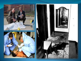 El resumen describe los pasos para realizar un examen externo de un cadáver, incluyendo la identificación, fecha aproximada de muerte basada en signos de rigor mortis y livideces, y causa de muerte como asfixia mecánica basada en características del surco en el cuello.