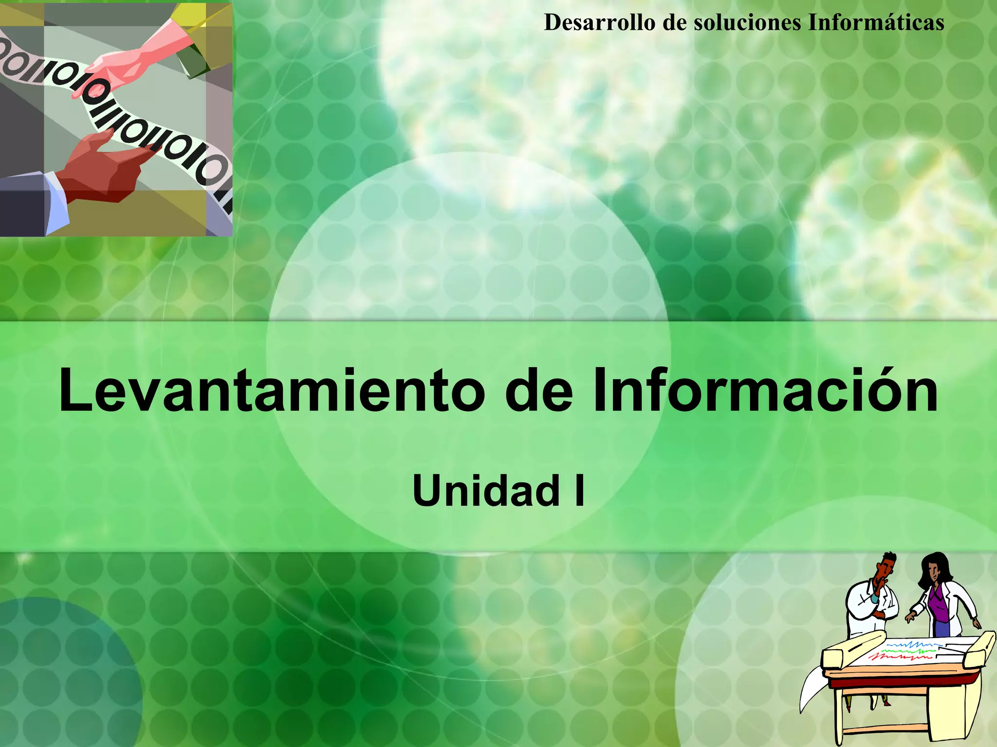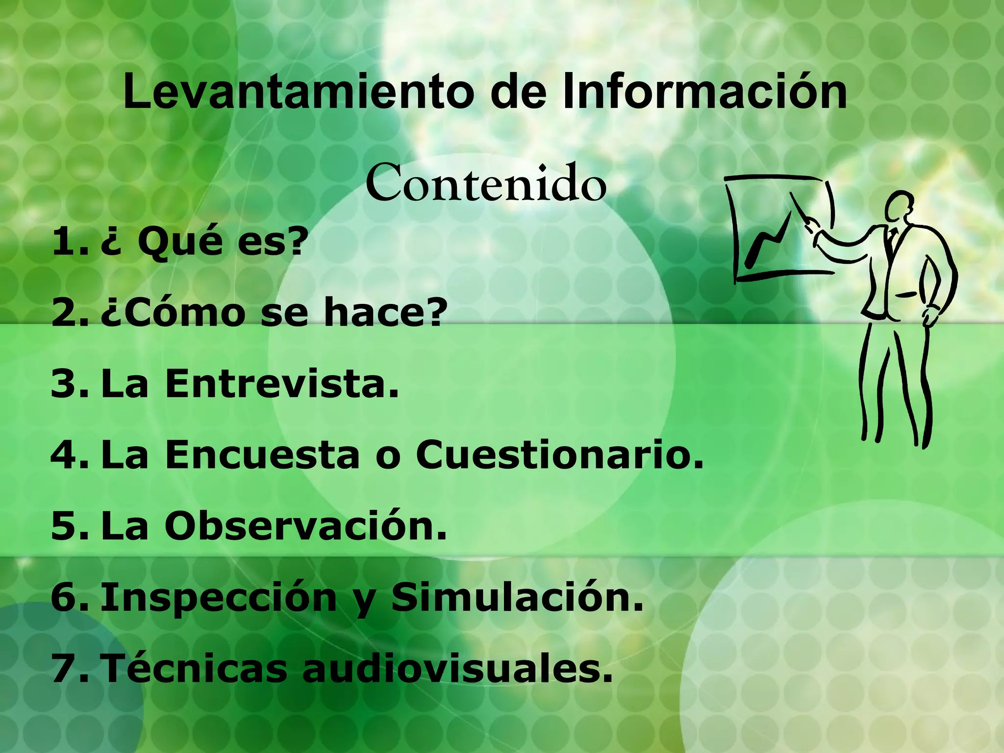 El documento describe las técnicas para el levantamiento de información en el desarrollo de soluciones informáticas, incluyendo entrevistas, encuestas, observación, inspección, simulación y técnicas audiovisuales. La entrevista y la encuesta son métodos para recopilar datos de usuarios, mientras que la observación, inspección y simulación analizan procesos y documentación.