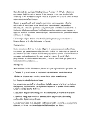 La leva es un elemento mecánico que permite transformar un movimiento circular en rectilíneo a través del contacto con un seguidor. Existen varios tipos de levas como de ranura, disco o tambor, cuyo perfil determina el movimiento del seguidor. Las levas se usan comúnmente en motores para abrir y cerrar válvulas en el momento preciso.