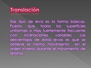 Este documento resume diferentes tipos de levas, incluyendo levas básicas, de disco y de tambor, así como sus ventajas y desventajas. También describe los diferentes tipos de movimientos que pueden generar las levas y los componentes clave de los mecanismos de levas.