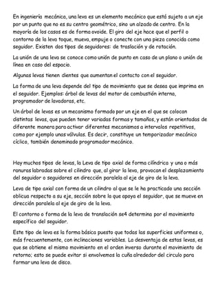 El documento explica el funcionamiento y tipos de levas mecánicas, elementos clave en ingeniería mecánica que transmiten movimiento mediante el contacto con un seguidor. Se detalla la importancia de la forma de la leva en relación con el movimiento del seguidor y se menciona la ley fundamental del diseño de levas, que regula su comportamiento. También se hace referencia a software especializado para el diseño de levas y sus aplicaciones en motores de combustión interna y otros mecanismos.