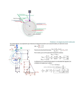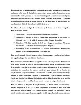 Este documento describe los principios básicos del diseño de sistemas leva-seguidor, incluyendo la clasificación, nomenclatura y aplicaciones comunes de levas y seguidores. Explica que el proceso de diseño implica seleccionar el tipo de movimiento deseado, la forma de la leva y el seguidor, considerando factores geométricos, ambientales, dinámicos y económicos. También cubre cómo definir el diagrama de desplazamiento y las dimensiones exactas de la leva para asegurar un funcionamiento adecuado