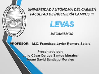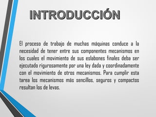 El documento describe los mecanismos de levas, que se usan para transmitir movimiento de manera precisa y coordinada entre componentes de máquinas. Explica que una leva es un elemento sujeto a un eje en un punto que no es su centro, causando que su contorno mueva u empuje a una pieza llamada seguidor cuando el eje gira. Además, detalla los componentes básicos de este mecanismo, los diferentes tipos de levas y seguidores, y esquemas de movimiento del seguidor.