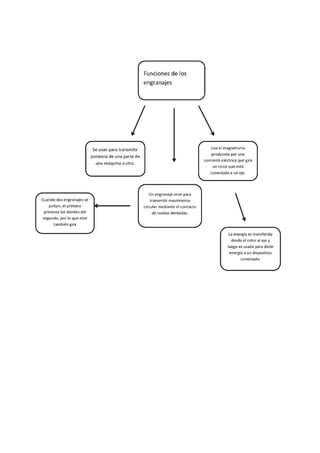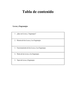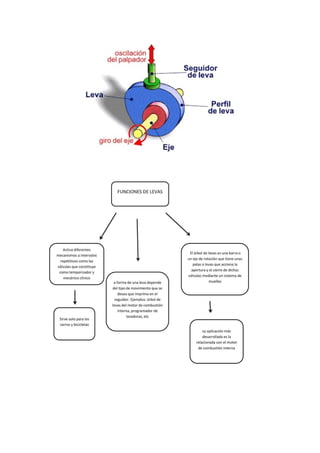 El documento describe levas y engranajes, partes fundamentales de máquinas. Explica que las levas convierten movimiento circular en lineal mediante contacto con un seguidor, y que los engranajes transmiten potencia mediante ruedas dentadas. También detalla la historia, funciones, partes y tipos de levas y engranajes, incluyendo sus usos para accionar válvulas y transmitir movimiento en motores y maquinaria.