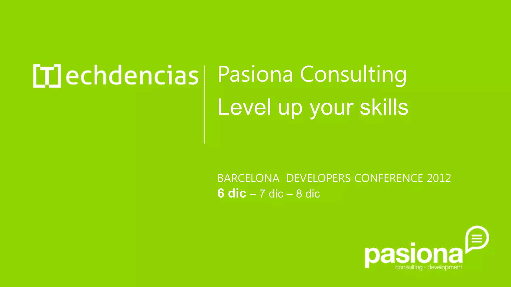 El documento presenta información sobre la Barcelona Developers Conference 2012 organizada por Pasiona, enfocándose en la innovación tecnológica y la mejora continua. Se mencionan principios de programación orientada a objetos y patrones de diseño como el principio de responsabilidad única y la inversión en dependencia. La conferencia también aborda la importancia de adaptarse a los cambios en el ámbito tecnológico y utilizar herramientas ya disponibles en lugar de reinventar soluciones.