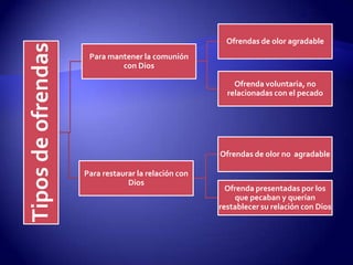1) El documento describe las ofrendas de cereales mencionadas en Levítico, incluyendo detalles sobre su preparación y presentación. 2) Representan a Jesucristo, quien se hizo hombre y pasó por sufrimientos para obedecer completamente a Dios. 3) El incienso representa la adoración a Dios, mientras que la harina y el aceite simbolizan a Jesús, quien fue fortalecido por el Espíritu Santo.