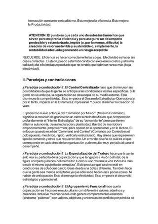 El documento describe las paradojas y contradicciones que surgen de los cuatro instrumentos comunes de organización (control centralizado, especialización del trabajo, agrupamiento funcional y estandarización interna) y cómo estos pueden limitar la efectividad y el desarrollo estratégico. También propone siete soluciones como el sistema gerencial dual y el compromiso de la alta dirección para promover el aprendizaje y anticipación necesarios para crear valor sostenible. El objetivo general es gestionar la dinámica empresarial a través de un proceso