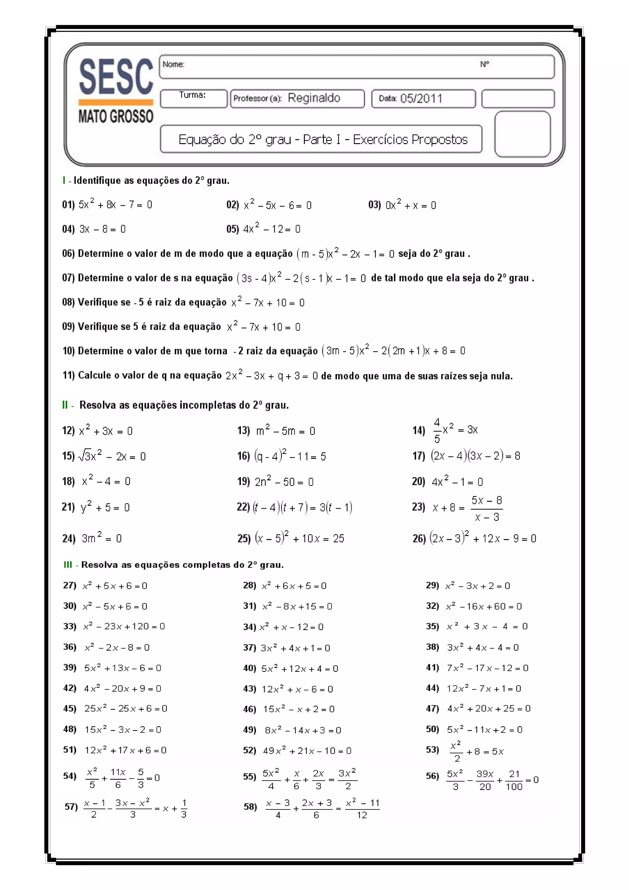 LISTA DE EXERCÍCIOS DO 2O. GRAU PARTE I