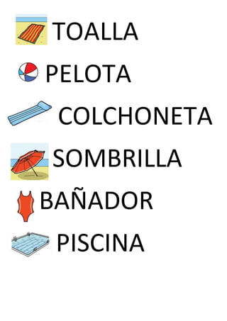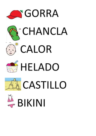 La lista enumera varios objetos y conceptos relacionados con la playa y el verano, incluyendo artículos de baño, accesorios, actividades acuáticas y el clima cálido.