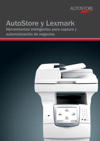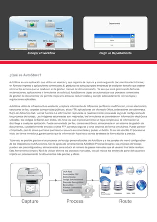 AutoStore es una aplicación que automatiza los procesos de gestión de documentos mediante la captura de información de diversas fuentes como dispositivos multifunción, correo electrónico y carpetas compartidas, y su posterior procesamiento y envío a aplicaciones y destinos como sistemas de gestión de documentos y correo electrónico. AutoStore se diferencia de otras herramientas por su capacidad de capturar desde múltiples fuentes, su proceso de captura reconocido, su flexibilidad de personalización y su interfaz intuitiva de arrastrar y soltar para crear pro