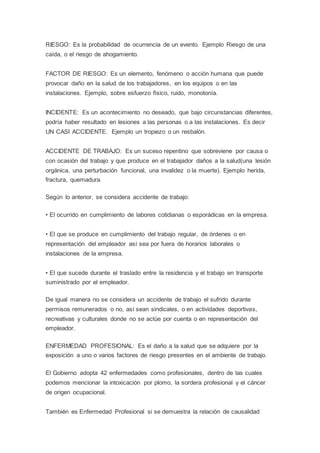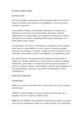 El documento presenta una introducción sobre la importancia de la salud ocupacional y la prevención de riesgos laborales para las empresas. Luego define conceptos clave como salud, trabajo, ambiente laboral, riesgo, factor de riesgo, accidente de trabajo y enfermedad profesional. Finalmente resume la legislación colombiana sobre seguridad social y salud ocupacional establecida en la Ley 100 de 1993 y el Decreto 1295 de 1994, incluyendo aspectos como el sistema de riesgos profesionales y la conformación de programas de salud ocupacional
