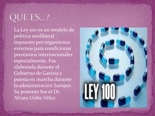 La Ley 100 de 1993 estableció el sistema de seguridad social en Colombia e incluyó el sistema general de pensiones, el sistema general de seguridad social en salud, el sistema general de riesgos profesionales y los servicios sociales complementarios. La ley buscó garantizar las prestaciones económicas y de salud para quienes tienen una relación laboral o capacidad económica para afiliarse al sistema. Sin embargo, con el tiempo surgieron problemas como la privatización de las EPS, que rechazaban a pacientes con enfermedades costosas, y la necesidad
