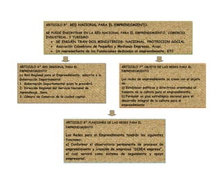 La ley 1014 tiene como objetivo promover el espíritu emprendedor en la educación colombiana. Establece la creación de redes nacionales y regionales para el emprendimiento para formular políticas que fomenten la cultura emprendedora. También dispone que la enseñanza del emprendimiento sea obligatoria en la educación formal y que las universidades puedan aceptar planes de negocios en lugar de trabajos de grado. Además, establece beneficios para emprendedores vinculados a las redes y la difusión de la cultura