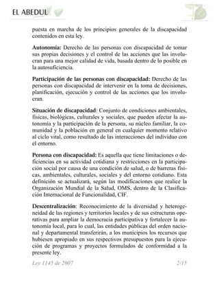 Este documento presenta la Ley 1145 de 2007 que organiza el Sistema Nacional de Discapacidad en Colombia. Establece que el Sistema Nacional de Discapacidad coordinará los esfuerzos entre entidades públicas, organizaciones de personas con discapacidad y sociedad civil para promover los derechos de las personas con discapacidad. Creará el Consejo Nacional de Discapacidad como organismo consultor y asesor del sistema, y establecerá comités departamentales, distritales, municipales y locales de discapacidad para la implementación de políticas a nivel territorial.