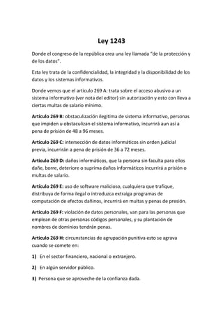La Ley 1243 establece la protección de datos, destacando la confidencialidad, integridad y disponibilidad de los sistemas informativos. Incluye artículos que penalizan el acceso abusivo a sistemas, obstaculización ilegal, intersección de datos sin orden judicial, daños informáticos y uso de software malicioso, con penas que van desde multas hasta prisión. Además, se agravan las penas en circunstancias específicas, como en el sector financiero o cuando se aprovecha la confianza de otros.