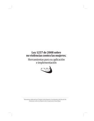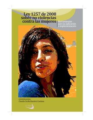 Este documento resume la Ley 1257 de 2008 sobre violencia contra las mujeres en Colombia. La ley establece medidas de prevención, protección y atención para las mujeres víctimas de violencia. También crea nuevos delitos como el acoso sexual y establece sanciones para los agresores. El documento explica los principales capítulos de la ley y provee herramientas e implementación para aplicarla de manera efectiva. El objetivo final es construir relaciones de género basadas en el respeto, la solidaridad y la igualdad para promover una