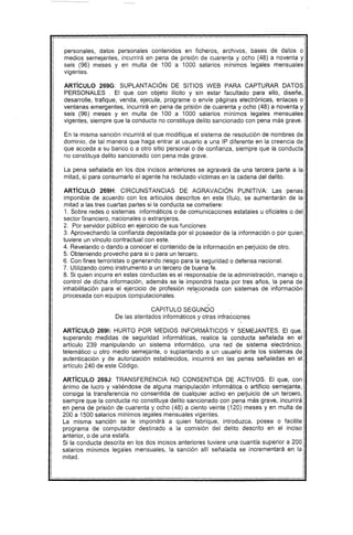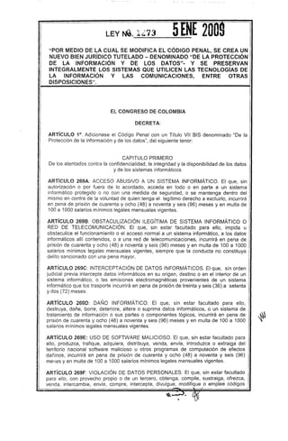 Este documento es una ley que modifica el Código Penal de Colombia para crear un nuevo bien jurídico relacionado con la protección de la información y los datos. Establece varios nuevos delitos informáticos como el acceso abusivo a sistemas, daño informático, violación de datos personales, y circunstancias agravantes cuando estos delitos se cometan contra sistemas estatales o financieros. También modifica el Código de Procedimiento Penal para que los jueces municipales puedan conocer estos nuevos delitos.