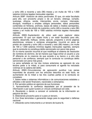 La ley 1273 de 2011 establece penas de prisión de 48 a 96 meses y multas de 100 a 1000 salarios mínimos por delitos informáticos como acceso abusivo a sistemas, daño informático, violación de datos personales, uso de software malicioso y otros. Además, agrava las penas si los delitos se cometen contra sistemas estatales o del sector financiero, o si se obtienen beneficios económicos.