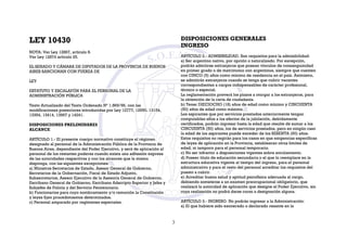 Este documento presenta la Ley 10.430 que establece el estatuto y escalafón para el personal de la administración pública de la provincia de Buenos Aires. La ley define el alcance, requisitos de ingreso, situaciones de disponibilidad, cese y reubicación del personal. Se especifican los requisitos de ciudadanía, edad, salud y estudios para el ingreso, así como las situaciones que impiden el ingreso como condenas penales o haber sido cesado por razones disciplinarias.