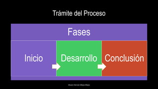 Este documento resume las consideraciones procedimentales de las fases de inicio, desarrollo y conclusión de un proceso arbitral según la Ley 1563 de 2012 sobre arbitraje nacional en Colombia. Explica los trámites de iniciación del proceso, integración del tribunal arbitral, instalación del tribunal, traslado de la demanda y otros aspectos de la fase de inicio. También cubre consideraciones contextuales como el amparo de pobreza, deber de información, impedimentos, recusaciones y control disciplinario.