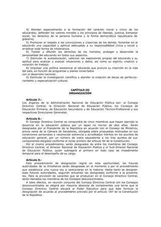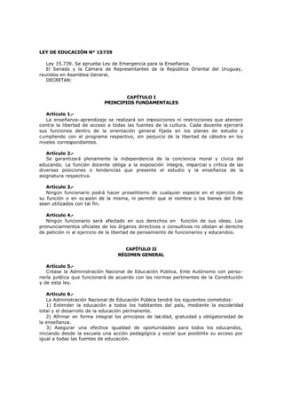 Esta ley establece una nueva Administración Nacional de Educación Pública en Uruguay con el objetivo de extender la educación a todos los ciudadanos de manera laica, gratuita y obligatoria. Se crean varios consejos como el Consejo Directivo Central y consejos de educación primaria, secundaria y técnico-profesional para administrar los diferentes niveles educativos. La ley define las atribuciones de estos consejos y órganos en términos de establecer planes de estudio, aprobar presupuestos, designar