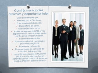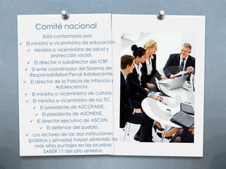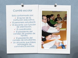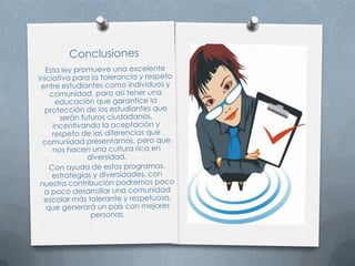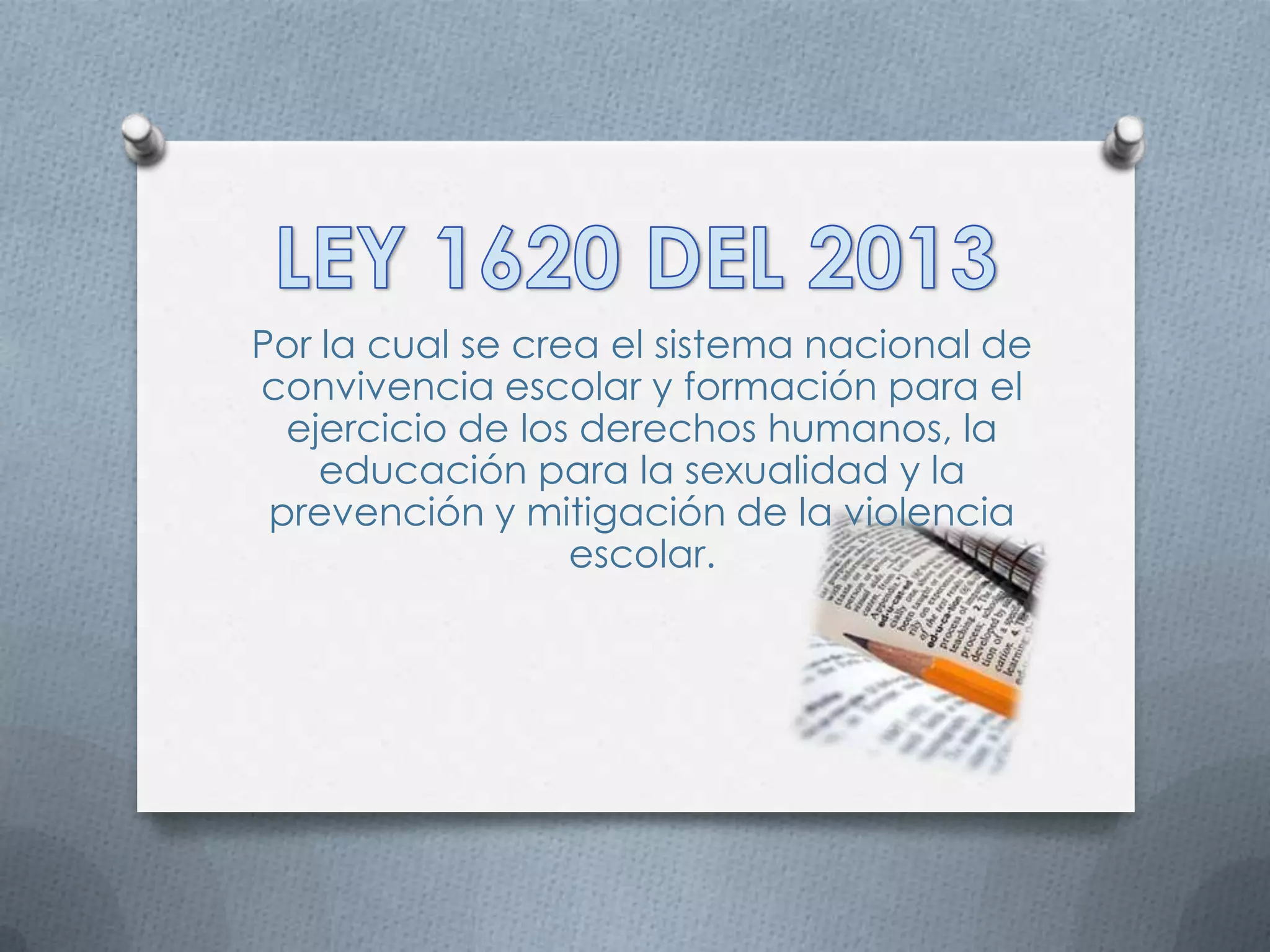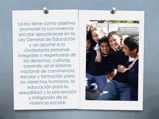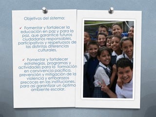 La ley crea un sistema nacional de convivencia escolar para promover los derechos humanos, la educación sexual y prevenir la violencia escolar. El sistema incluye un comité nacional y comités a nivel municipal, distrital y departamental que trabajan con los comités escolares de cada institución educativa.