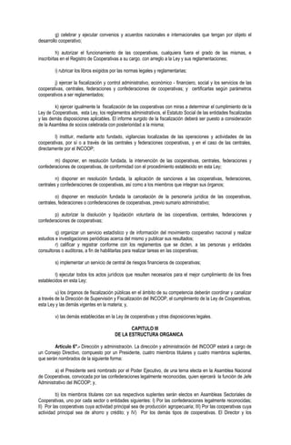 Este documento establece la estructura y funciones del Instituto Nacional de Cooperativismo (INCOOP) en Paraguay. El INCOOP es la autoridad de aplicación de la legislación cooperativa y control de entidades cooperativas. Su dirección y administración está a cargo de un Consejo Directivo compuesto por un Presidente y cuatro miembros titulares. El Consejo Directivo supervisa el cumplimiento de la ley cooperativa, aprueba planes y presupuestos, y autoriza la apertura y cierre de oficinas. El INCOOP promueve el des