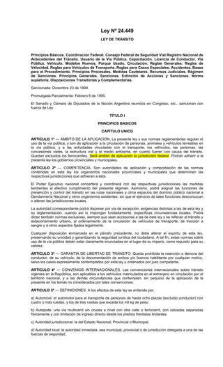 La ley 24.449 establece los principios básicos de tránsito en Argentina, crea el Consejo Federal de Seguridad Vial para coordinar las políticas entre jurisdicciones, y el Registro Nacional de Antecedentes del Tránsito para intercambiar información sobre licencias de conducir y sanciones. También define términos clave como automóvil, autopista, autoridad jurisdiccional, y establece reglas generales para la circulación de vehículos y peatones.