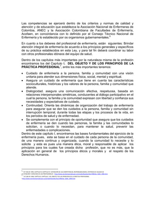 La Ley 266 de 1996 regula la profesión de enfermería en Colombia. Establece que la enfermería es una profesión social cuyo objetivo es brindar cuidado integral de salud a personas, familias y comunidades. Se rige por el Consejo Técnico Nacional de Enfermería, el Tribunal de Ética de Enfermería y la Asociación Nacional de Enfermeras de Colombia. Los principios fundamentales de la enfermería incluyen el cuidado holístico de las personas, el respeto por la diversidad cultural y la comunicación efectiva.