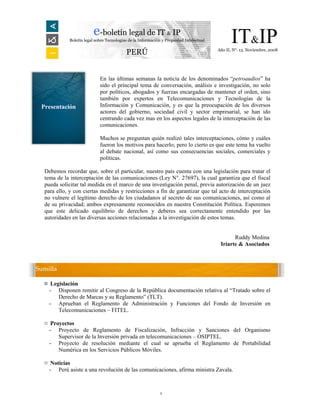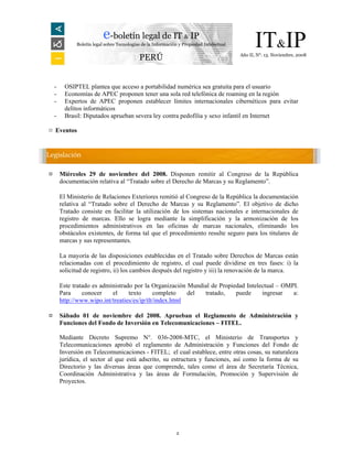 El documento resume noticias y proyectos relacionados con las tecnologías de la información y la propiedad intelectual en Perú. Se menciona que el Ministerio de Relaciones Exteriores remitió al Congreso documentación sobre un tratado de marcas. También se aprueba un reglamento para el Fondo de Inversión en Telecomunicaciones y se publican proyectos sobre regulaciones de OSIPTEL. Finalmente, se discuten temas como la portabilidad numérica y la necesidad de establecer límites internacionales para evitar delitos cibernétic