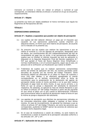 La ley n.° 29173 establece un régimen de percepciones del impuesto general a las ventas (IGV) en Perú, definiendo términos y condiciones que regulan las obligaciones de los sujetos del IGV y los agentes de percepción. Esta normativa incluye disposiciones sobre la devolución de percepciones, la aplicación de montos percibidos y el tratamiento de operaciones de venta gravadas con IGV. Además, se detallan regulaciones específicas relacionadas con las operaciones en moneda extranjera y la imposibilidad de compensar créditos tributarios por parte de los agentes de percepción.