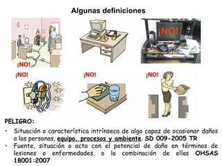 Este documento presenta los principios y marco legal de la gestión de seguridad y salud en el trabajo en Perú. Define conceptos clave como peligro y riesgo. Establece que la política debe promover una cultura de prevención aplicable a todos los sectores. Describe el sistema nacional e instituciones involucradas como el Consejo Nacional de Seguridad y Salud en el Trabajo. Finalmente, detalla los componentes del sistema de gestión que las organizaciones deben implementar, incluyendo identificación de peligros, evaluación de riesgos, planes de acc