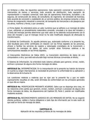 Esta ley define y reglamenta el acceso y uso de los mensajes de datos, el comercio electrónico y las firmas digitales en Colombia. Establece que los mensajes de datos tendrán validez legal y fuerza probatoria equivalentes a los documentos escritos tradicionales. Además, crea las entidades de certificación para emitir certificados digitales que autentiquen la identidad de las personas y firmas en el comercio y comunicaciones electrónicas.
